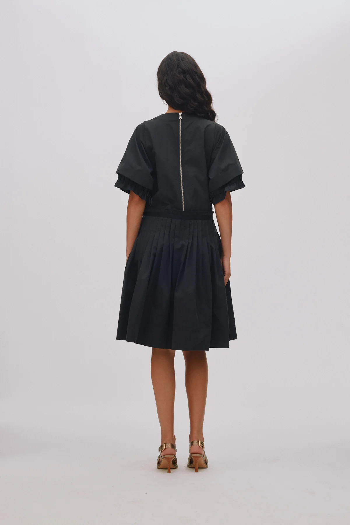 The dress is designed with short sleeves that have a slight flare. It features delicate ruched details that create a feminine and refined drape. A discreet zipper at the back makes it easy to put on and take off. The front and sleeves are detailed with subtle adjustable ties, allowing you to customize the fit as desired.